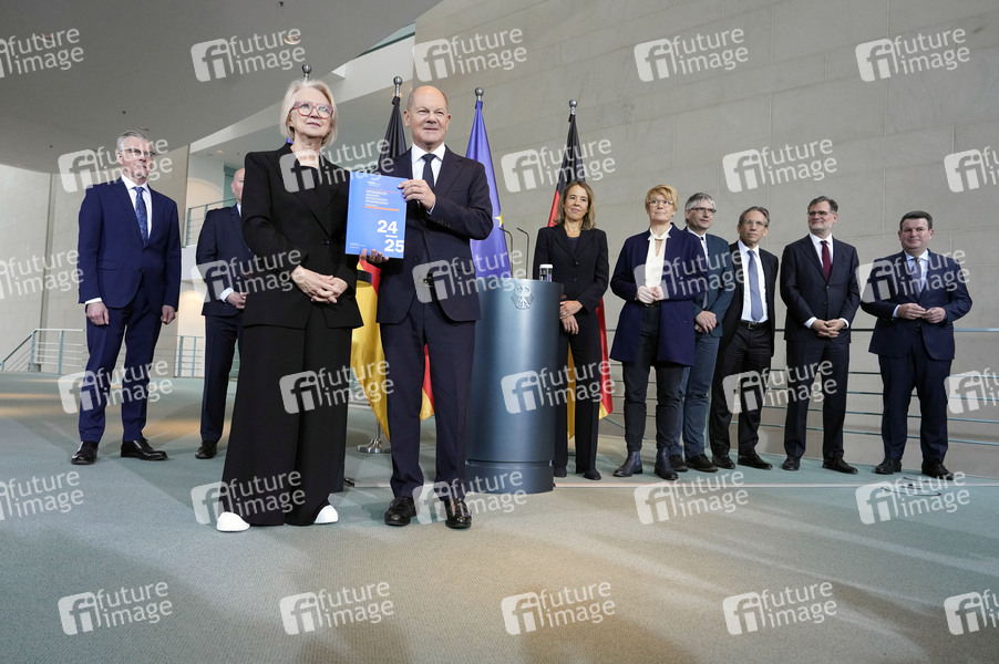Olaf Scholz bei der Übergabe des Jahresgutachtens 2024/2025 des Sachverständigenrats zur Begutachtung der gesamtwirtschaftlichen Entwicklung an den Bundeskanzler in Anwesenheit von Ministern sowie der SVR-Mitglieder im Bundeskanzleramt.Berlin, 13.11.2024