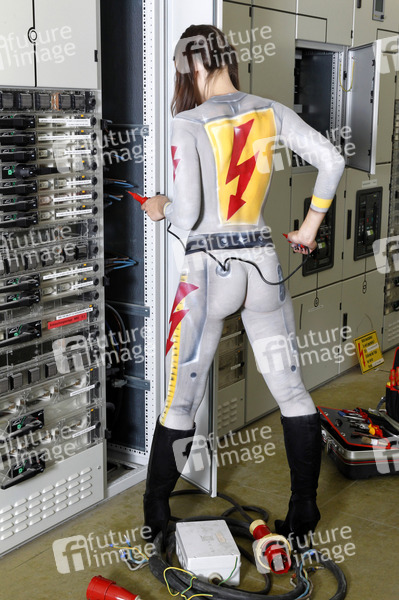 Bodypainting, Body-Painting, Erotik, Frau, Mädchen, nackt, Akt, weiblich, Körperkunst, Körperfarben, Farbe, Bemalung, Kunst, Malerei, drinnen, Strom, Elektrizität, Sicherungen, Stromversorgung, Energieversorgung, Superheld, Superheldin, Energy-Girl, Joerg Dewaldo Duesterwald, body painting, erotic, woman, girl, nude, female, body art, colors, indoors, power, electricity, fuses, power supply, superhero