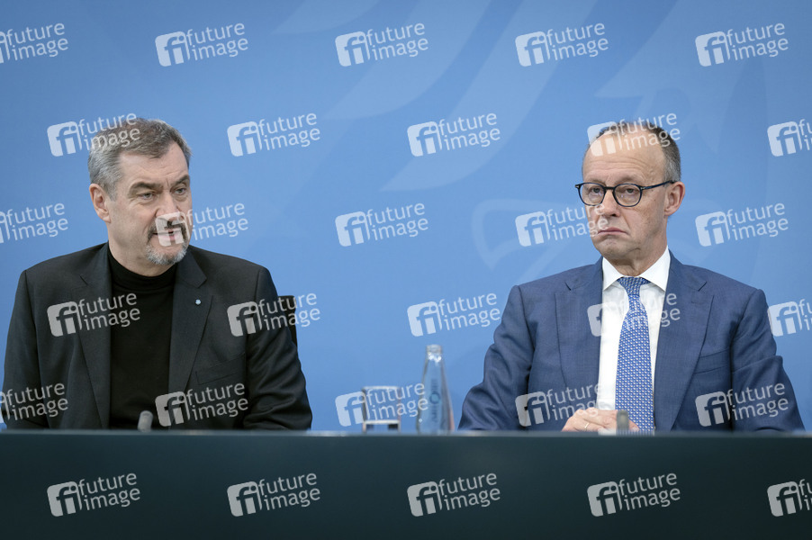 Markus Söder und Friedrich Merz bei einer Pressekonferenz nach der Sitzung des Koalitionsausschusses von Union und SPD im Kanzleramt. Berlin, 11.12.2025