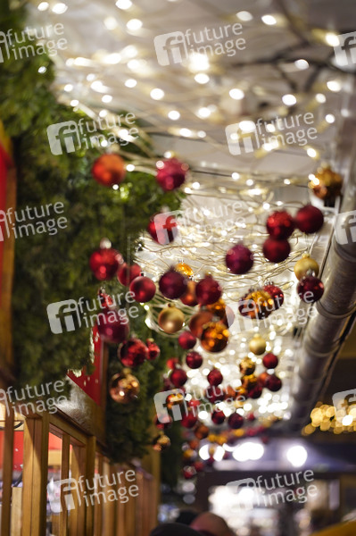 Weihnachtsschmuck aus roten und goldenen Weihnachtskugeln - Der Weihnachtszauber am Gendarmenmarkt findet aufgrund von Bauarbeiten in den Jahren 2022-2024 am Bebelsplatz an der Staatsoper statt. Berlin, 26.11.2022