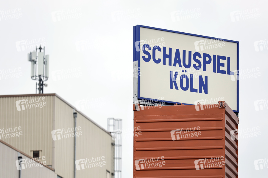 Ein Schild des Schauspiel Köln an den Interimsspielstätten des Kölner Schauspiel mit Depot 1 und Depot 2 auf dem Gelände des Carlswerks in der Schanzenstraße in Köln-Mülheim. Schon seit Jahren gibt es Probleme und Chaos rund um die Sanierung von Oper und Schauspielhaus Köln. Die Bauarbeiten sollen nun voraussichtlich 2024 abgschlossen sein. (Themenbild; Symbolbild) Köln; 05.07.2021