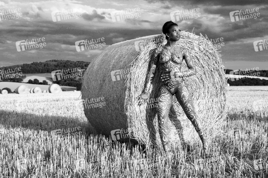Bodypainting, Erotik, Frau, Mädchen, Afrikanerien, nackt, draußen, weiblich, Körperkunst, Kunst, Ornamente, Malerei, Feld, Acker, Stoppelfeld, Heuballen, Stroh, Landwirtschaft, Ernte, Abendsonne, erotic, African woman, girl, nude, outdoor, female, body art, body painting, ornaments, field, hay, straw, farming, harvest, evening sun