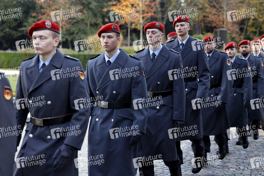 Rekruten und Rekrutinnen nehmen anlässlich des 66. Gründungs-jahres der Bundeswehr am feierlichen Gelöbnis vor der Villa Hammerschmidt in Bonn teil. 50 Soldatinnen und Soldaten des ABC-Abwehrbataillons 7 aus Höxter und des ABC-Abwehrbataillons 750 aus Bruchsal legen hier ihr Gelöbnis ab. Bonn, 12.11.2021