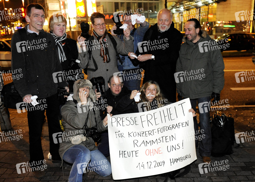 Hamburger Konzertfotografen boykottieren das Rammsteinkonzert am 14.12.2009 aufgrund von Knebelverträgen. Stellvertretend auch fuer viele weitere Kollegen trafen sich spontan die Fotografen Philipp Szyza (2-kameraden), Christian Fischer (Bühnenblicke), Rainer Merkel, Joerg-Martin Schulze (jms-photo), Carsten Schem (Concert Views), Marco Maas (Fotograffirma), Heiko Sehrsam (Pics Hamburg), Nicola Ruebenberg (Face To Face), Isabel Schiffler (Jazz Archiv), Markus Lubitz (Jazz Archiv) zum gemeinsamen Protestfoto. Der Vertag der Rammstein GbR reduziert u.a. die Verbreitungsmoeglichkeiten der Konzertfotos auf ein einziges, namentlich zu bezeichnendes Medium und beinhaltet, dass Rammstein die Bilder gratis für eigene Zwecke nutzen darf. Bildjournalistinnen und -journalisten sollen der Band gestatten, Fotos für die Nutzung auf Webpages von Rammstein oder dem Management der Band ohne gesonderte Verguetung nutzen.