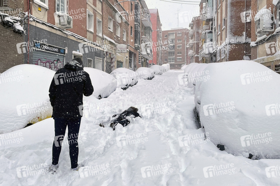 Barrio de Salamanca - Das Sturmtief Filomena sorgt in der Region Madrid und anderen Teilen Spaniens mit starken Schneefällen für Chaos. Die Hauptstadt Madrid wurde durch historisch heftigen Schneefall lahmgelegt. Seit 50 Jahren hat es nicht so geschneit. Der Verkehr ist in weiten Teilen des Landes zusammengebrochen. Madrid, 09.01.2021
