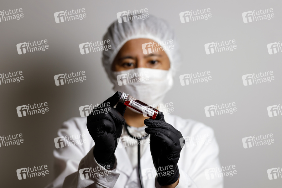 Eine Virologin posiert mit einer Corona-Blutprobe (Symbolfoto mit Model)