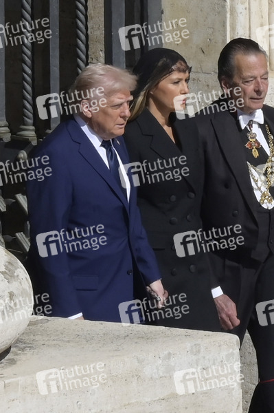 Donald Trump mit Ehefrau Melania Trump bei der Trauermesse für den verstorbenen Papst Franziskus auf dem Petersplatz. Vatikanstadt, 26.04.2025