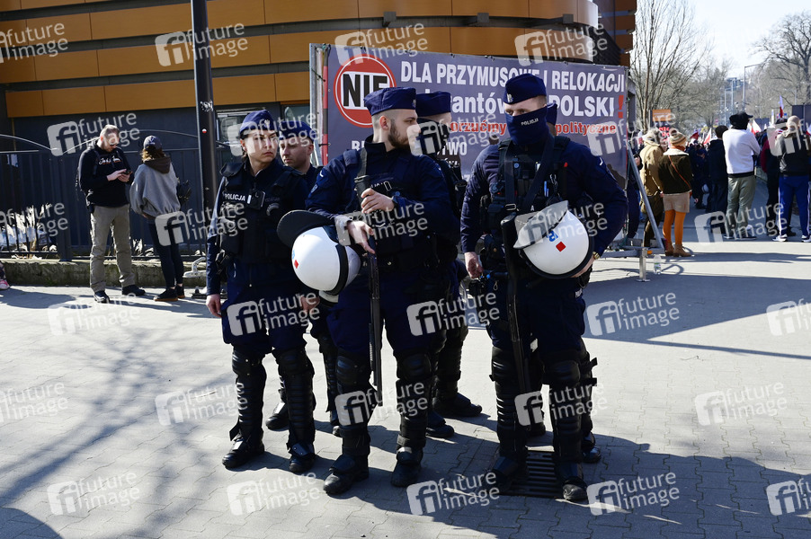 Polizei bei der Demo von rechten und nationalen Gruppen aus Polen gegen die deutsche Asylpolitik am Grenzübergang Görlitz/Zgorzelec - Stadtbrücke, welche aus Sicherheitsgründen mehrere Stunden gesperrt war. Görlitz/Zgorzelec, 22.03.2025