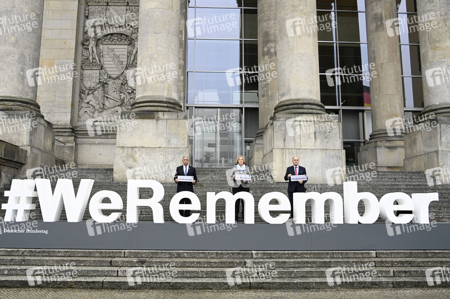 Mickey Levy, Bärbel Bas und Wolfgang Sobotka bei den Pressestatements von Wolfgang Sobotka, Mickey Levy und Bärbel Bas am Schriftzug #WeRemember zur Erinnerung an die Millionen im Nationalsozialismus ermordeten Juden vor dem Reichstagsgebäude. Berlin, 25.01.2022