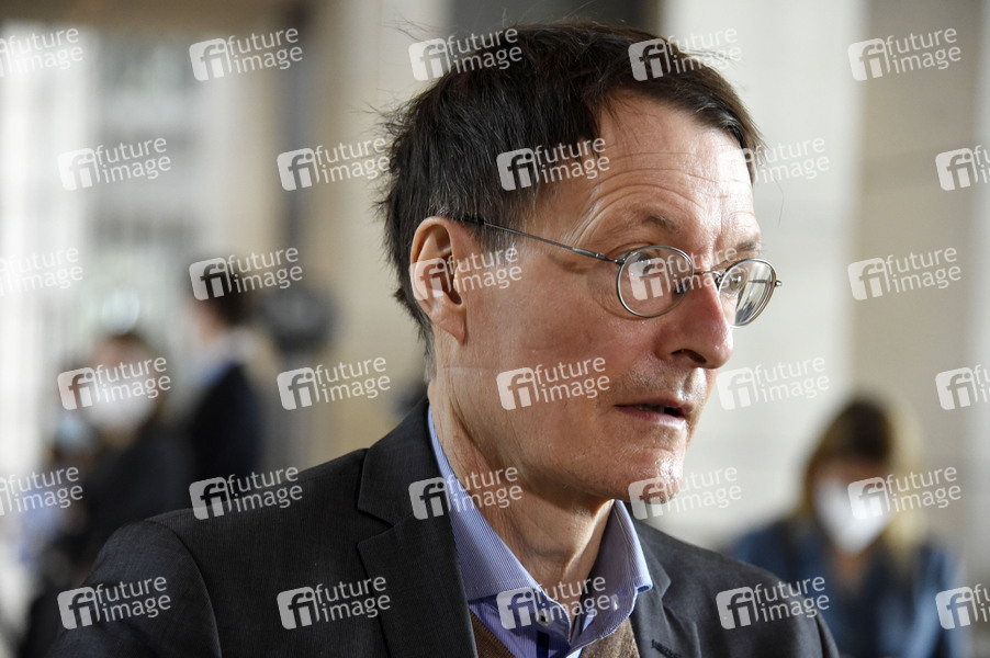 Karl Lauterbach beim Pressestatement nach der Befragung der Bundesregierung in der 217. Sitzung des Deutschen Bundestages im Reichstagsgebäude. Berlin, 24.03.2021