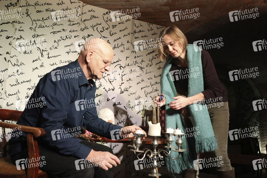 Josephine Hoppe mit ihrem Ehemann Dirk Neumann bei der Aufzeichnung der Fernsehsendung zum 100. Geburtstag von Herbert Köfer in Hoppes Hoftheater. Dresden, 06.02.2021
