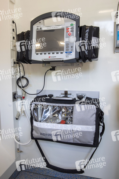 Defibrillator- und Patientenmonitor und Beatmungsgerät im Rettungswagen (RTW) anlässlich des Tages der 'Ersten Hilfe' im Führungs- und Schulungszentrum der Feuerwehr Köln. Köln, 11.09.2020