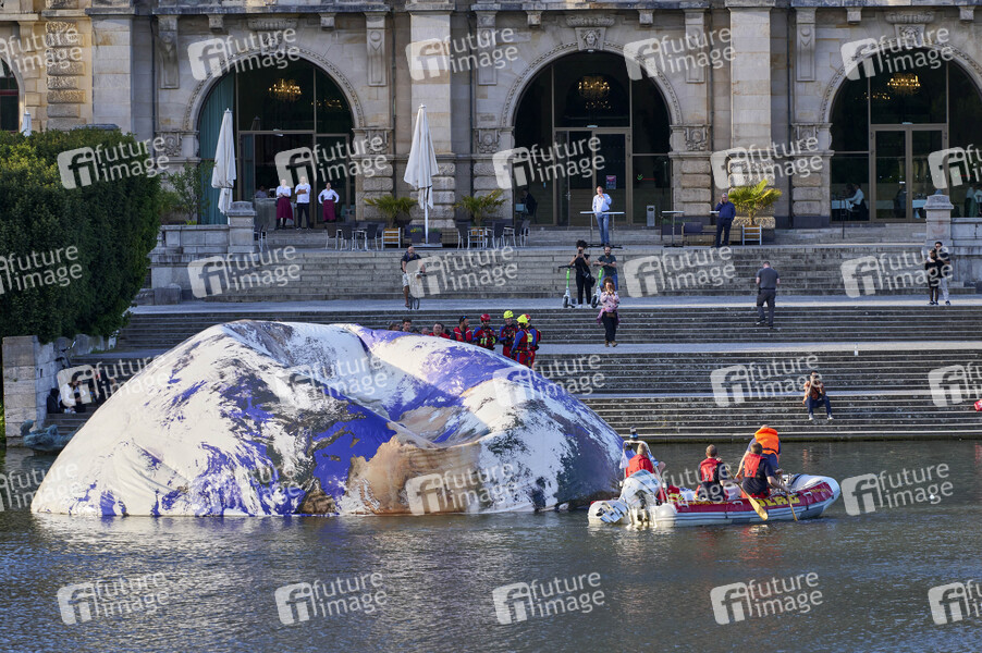 Einen Tag vor der Eröffnung der KunstFestSpiele Herrenhausen haben starke Windböen die Kunstinstalltion Floating Earth (schwimmende Weltkugel) des britsichen Künstlers Luke Jerram auf dem Maschteich so stark gedrekt das Wasser in die Luftkammern gelaufen ist. Mitglieder des DLRG haben vom Boot aus die verbliebene Luft aus der Kugel gedrückt und versuchen das Wasser aus der Kunstinstallation zu pumpen, damit Floting Earth zur Eröffnung am 16.Mai 2024 wieder beleuchtet und ausgestellt werden kann. Hannover, 15.05.2024