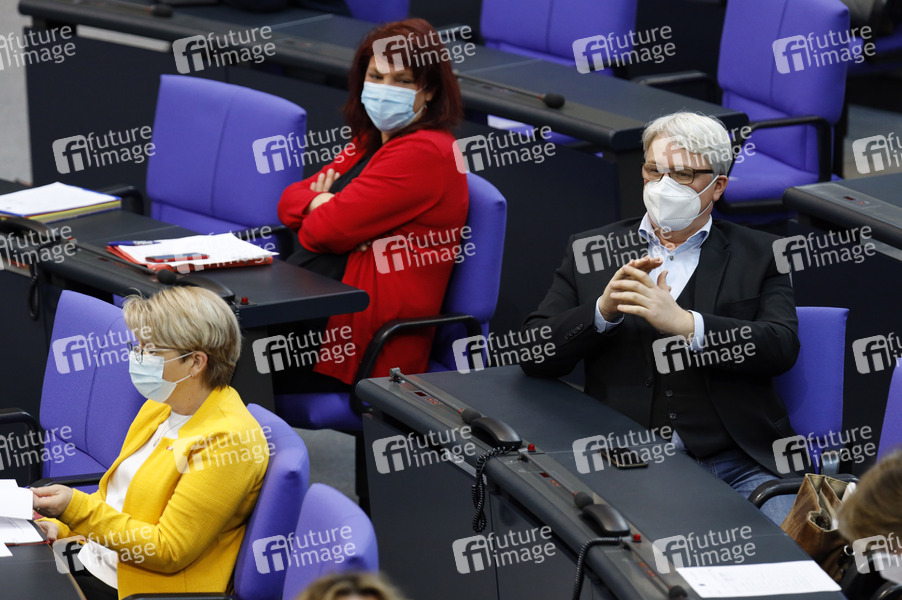 Politiker (Katrin Werner, Gabriele Katzmarek und Sönke Rix) m Deutschen Bundestag von DIE LINKE und SPD tragen durch Zufall die Farben der Nationalflagge (Schwarz, Rot, Gold) auf. Schwarz-Rot-Gold sind nach Artikel 22 des deutschen Grundgesetzes die Farben der Flagge der Bundesrepublik Deutschland. Traditionell führt man die Farben auf die Befreiungskriege von 1813 bis 1815 zurück. (Themenbild, Symbolbild) Berlin, 12.02.2021