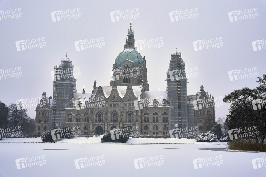 Zugefrorener schneebedeckter Maschteich und Neues Rathaus. Hannnover, 08.02.2021
