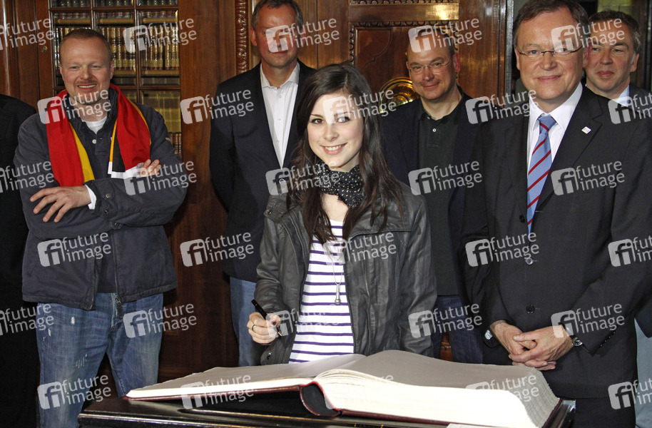 Nach ihrem Sieg beim Eurovision Song Contest in Oslo, trägt sich die Siegerin Lena ins Goldene Buch der Stadt Hannover ein