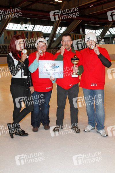 Fiona Erdmann mit dem Hörerteam beim '94,3 rs2 - Live: Wir gegen Dir - On Ice!'- Eishockey-Event im Erika-Hess-Eisstadion. Berlin 08.03.2013