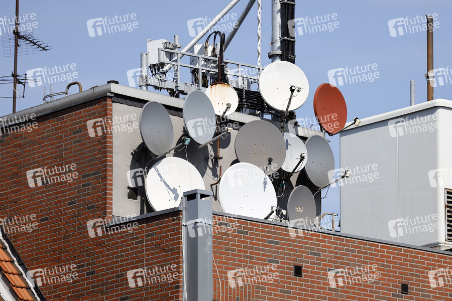 Satellitenschüsseln auf einem Dach in Köln. Mit Satellitenschüsseln lassen sich auch ausländische Programme in Deutschland empfangen. (Themenbild, Symbolbild) Köln, 26.08.2021