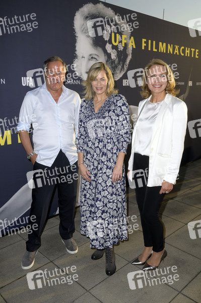 Nico Hofmann, Gesine Cukrowski und Karin Schlautmann beim Eröffnungsempfang der UFA Filmnächte 2022 auf der Dachterrasse der Bertelsmann Repräsentanz. Berlin, 24.08.2022