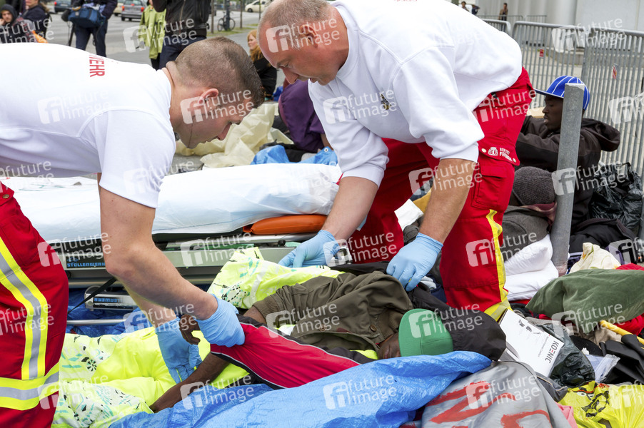 Ein Refugee wird von Sanitätern der Berliner Feuerwehr mit einem Rettungswagen ins Krankenhaus gebracht. Am Berlin Congress Center (bcc) befinden sich Flüchtlinge seit 6 Tagen im Hungerstreik. Sie fordern den Stopp aller Abschiebungen, dauerhafte Anerkennung des Aufenthaltes und die Aufhebung der Dublin-Verträge. Berlin, 08.05.2014