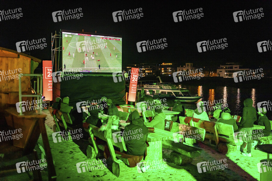 Public Viewing des Nachrichtenportals TAG24 bei der Strandbar Magdeburg. Etwa 70 Fans schauen sich bei 3 Grad Celsius und mit Glühwein die Partie Spanien gegen Deutschland (1:1) der FIFA Weltmeisterschaft 2022 in Katar an. Magdeburg, 27.11.2022