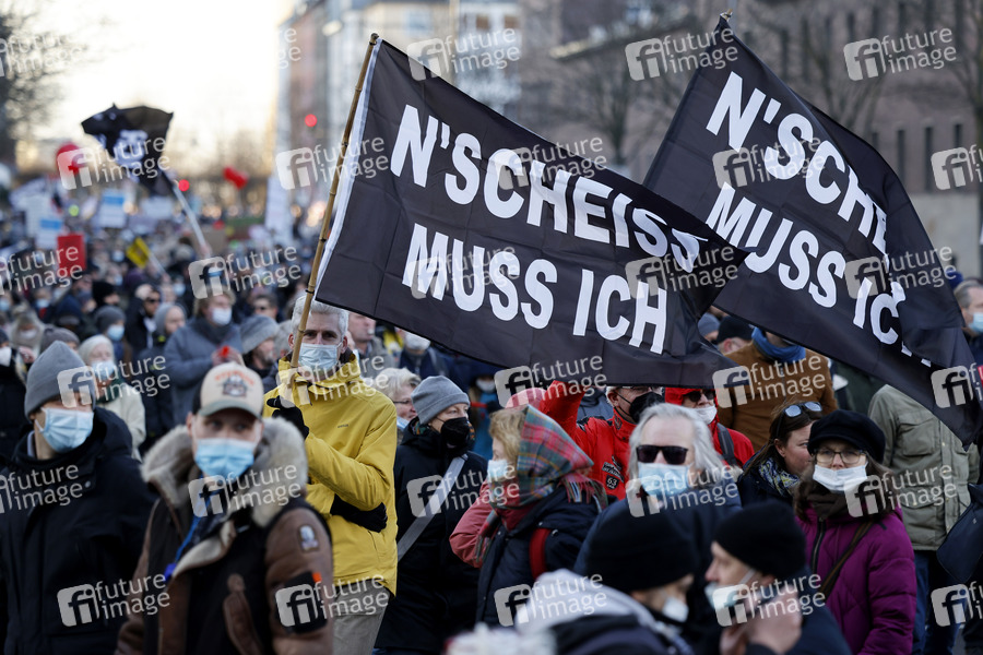 Bei einer angemeldeten Demo unter dem Motto 'Wir alle gemeinsam - Freie Impfentscheidung' demonstrierten etwa 12.000 Gegner einer Impfpflicht mit einem Spaziergang gegen die Corona-Maßnahmen der Bundesregierung und für eine individuelle Impfentscheidung, Grundrechte und 'unversehrte' Kinder - darunter auch viele Pflegekräfte, die wegen der Impfpflicht im Gesundheitsbereich ihren Job zu verlieren drohen. Düsseldorf, 12.02.2022