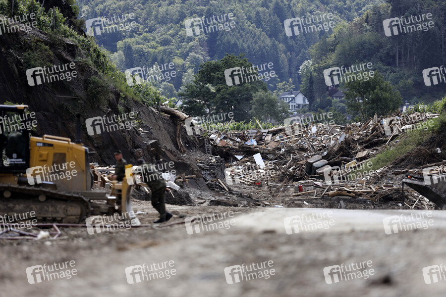 Nach dem Jahrhunderthochwasser in der Eifel durch heftige Regenfälle und Dauerregen mit Überschwemmungen und Überflutungen haben die Aufräumarbeiten im Ahrtal große Fortschritte gemacht. Einheiten von Polizei, THW, Bundeswehr und Feuerwehr mitsamt vielen freiwilligen Helfern haben Straßen geräumt, Schutt und Schlamm entfernt und die Menschen versorgt. Der Wiederaufbau wird trotzdem Jahre dauern. Im Bild Flutschäden nahe der Ortschaft Rech, in der die Flut viele Häuser zerstörte, 30.07.2021