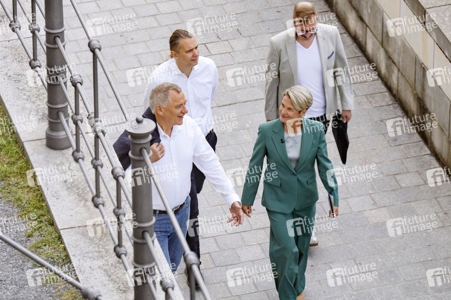 Jan van Aken und Anna Engelke beim ARD-Sommerinterview auf der Terrasse vom Marie-Elisabeth-Lüders-Haus. Berlin, 17.08.2025