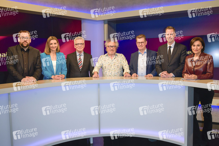 Paul Ronzheimer, Sarah Frühauf, Thomas de Maizière, Urban Priol, Ralf Stegner, Christian Dürr und Sandra Maischberger in der ARD-Talkshow 'maischberger' im Studio Berlin Adlershof. Berlin, 18.03.2025