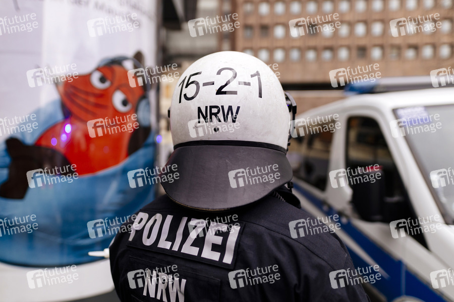 Oma-Gate, Omagate, Klimasau, Klima-Sau, Umweltsau, Umwelt-Sau, Proteste, Demo, GEZ, Rundfunkbeitrag, Beitragsgebühren, Rundfunkgebühren, WDR, Satire, Polizist, Polizistin, Polizei, Hundertschaft, Polizeieinsatz, Polizeibeamte, Polizeibeamter, Polizei-Hundertschaft, Innere Sicherheit, Polizeikräfte, Polizeipräsenz, Polizeiaufgebot, Sicherheitsmaßnahmen, Polizeikräfte, Gewaltmonopol, Polizeibeamte, Einsatkräfte, WDR-Demo, Omagate-Demo, Demo, Demonstration, Demonstranten, Politik, Medienkritik, Versammlungsrecht, Symbolbild, Symbolfoto
