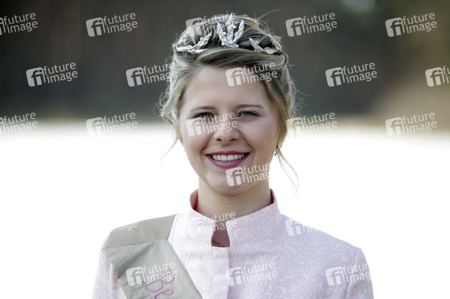 Spargelkönigin Gina Luise Schrey beim traditionellen Spargelanstich zur Eröffnung der Spargelsaison 2020 im Beelitzer Ortsteil Schäpe. Beelitz, 07.04.2020