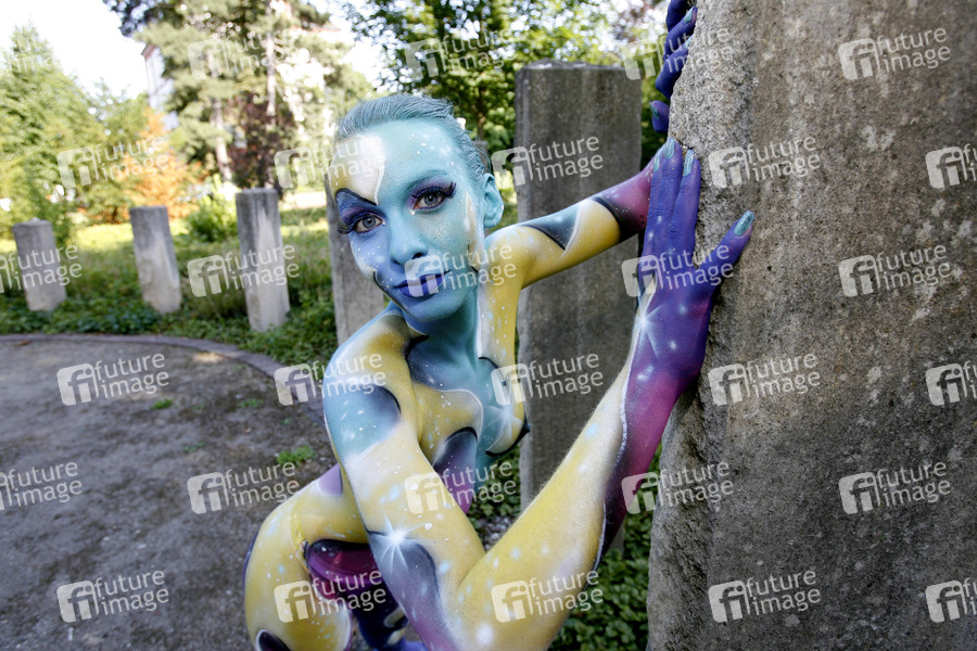 Bodypainting und Fotoshooting mit Model Sarah am Tag der offenen Tür der Meisterschule Justus-von-Liebig-Schule, Abteilung Floristik in Hannover-Ahlem. Künstler: Jörg Düsterwald
