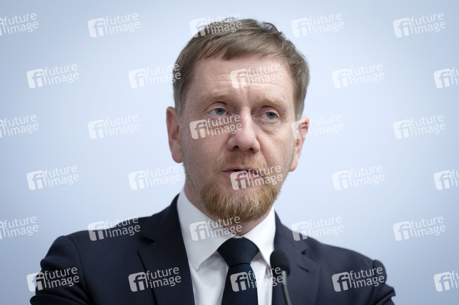 Michael Kretschmer beim Pressestatement zum 2. Mittelständischen Stahlgipfel in der Vertretung des Freistaates Sachsen beim Bund. Berlin, 21.11.2025