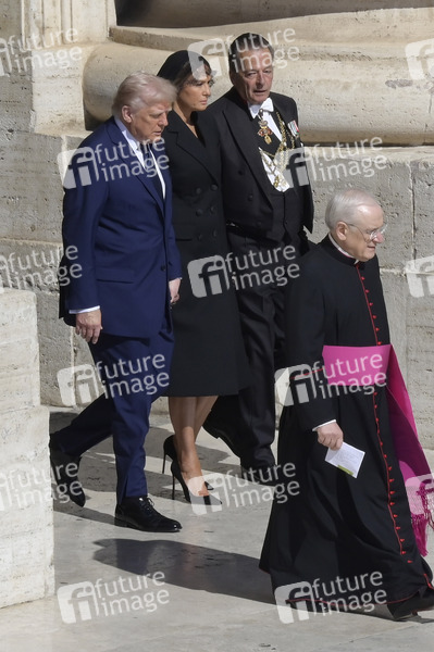 Donald Trump mit Ehefrau Melania Trump bei der Trauermesse für den verstorbenen Papst Franziskus auf dem Petersplatz. Vatikanstadt, 26.04.2025