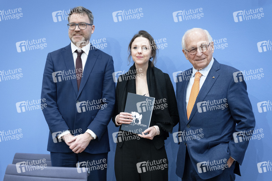 Tobias Bunde, Sophie Eisentraut und Wolfgang Ischinger bei der Bundespressekonferenz 'Zur bevorstehenden Münchner Sicherheitskonferenz und zum Munich Security Report 2026' im Haus der Bundespressekonferenz. Berlin, 09.02.2026