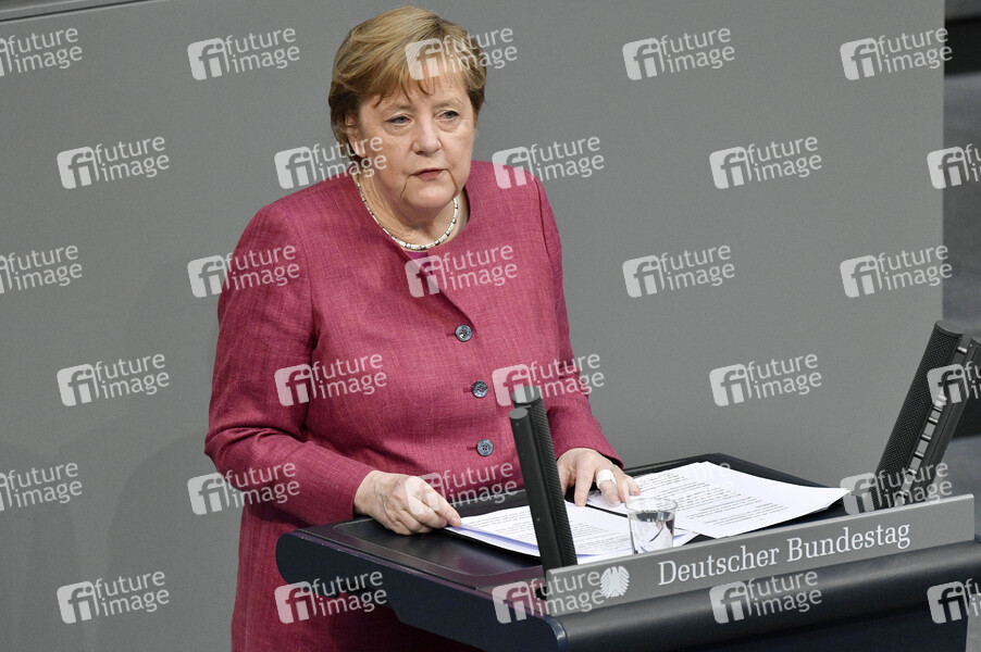 Angela Merkel in der 222. Sitzung des Deutschen Bundestages im Reichstagsgebäude. Berlin, 16.04.2021