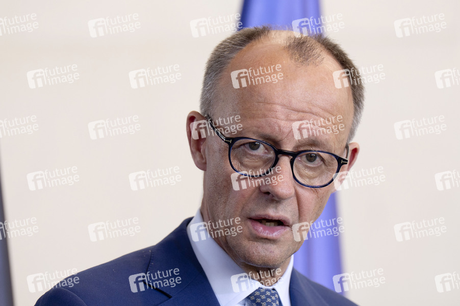 Friedrich Merz beim Empfang des Ministerpräsidenten von Griechenland mit militärischen Ehren und zu einem gemeinsamen Gespräch mit anschließendem Pressestatement im Bundeskanzleramt. Berlin, 13.05.2025