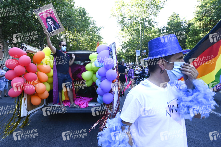 Wegen der Coronakrise nimmt die LGBT-Community viele ihrer Veranstaltungen online wahr. Etliche Aktivisten gingen trotzdem zur Guia del Orgullo LGTBI / Gay Pride Parade 2020 auf die Straße. Madrid, 28.06.2020