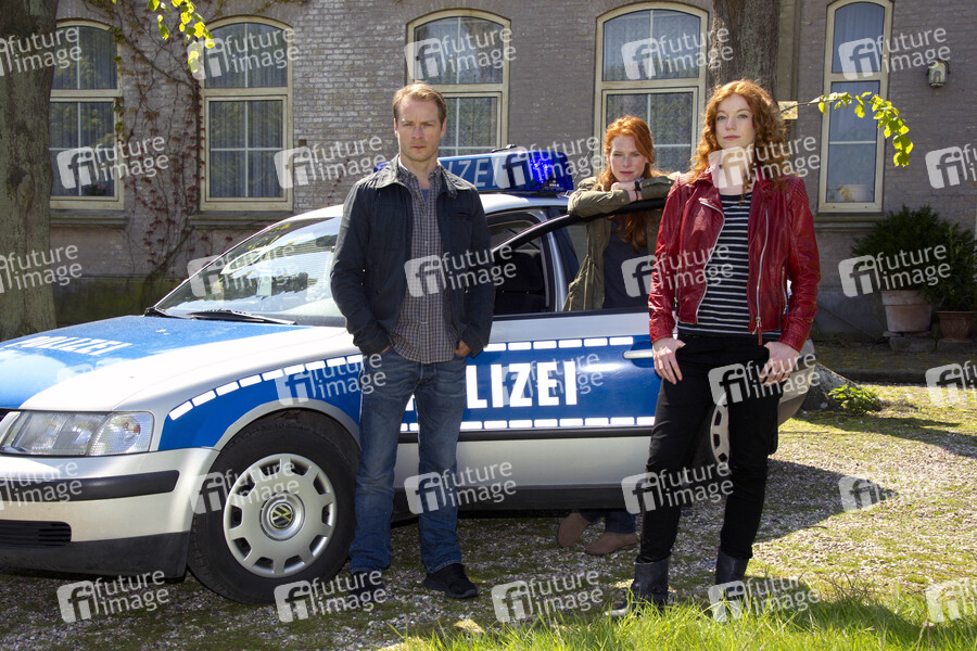 Henny Reents, Hinnerk Schoenemann und Marleen Lohse beim Fototermin am Set das ARD-Krimis 'Nord bei Nordwest' auf dem Flügger Hof. Fehmarn, 20.05.2014