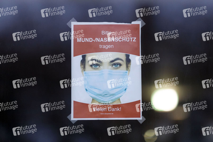 Wegen der Corona-Pandemie haben sich Bund und Länder auf eine Verlängerung des Lockdown bis Mitte Februar geeinigt. Somit bleiben beispielsweise Restaurants, Kulturbetriebe und viele Geschäfte im Einzelhandel geschlossen. In Geschäften und dem Nahverkehr besteht zudem ab Montag eine Pflicht zu medizinischen Masken (FFP2-Masken oder OP-Masken). Im Einzelhandel drohen zudem tausende Insolvenzen, weil vom Staat versprochene Finanzhilfen immer noch nicht rechtzeitig ankommen. Im Bild ein Hinweisschild, das Kunden zum Tragen einer Mund-Nasen-Bedeckung bittet an einem Laden in der Kölner Altstadt. (Themenbild, Symbolbild) Köln, 23.01.2021