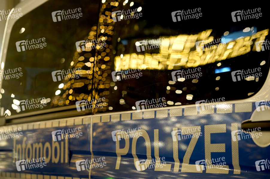 Spiegelung des Weihnachsmarktschriftzugs City-Weihnachtsmarkt und eines beleuchteten Weihnachtsbaums mit dem Informobil der Polizei auf dem 39. Weihnachtsmarkt an der Gedächtniskirche am Breitscheidplatz. Berlin, 07.12.2022