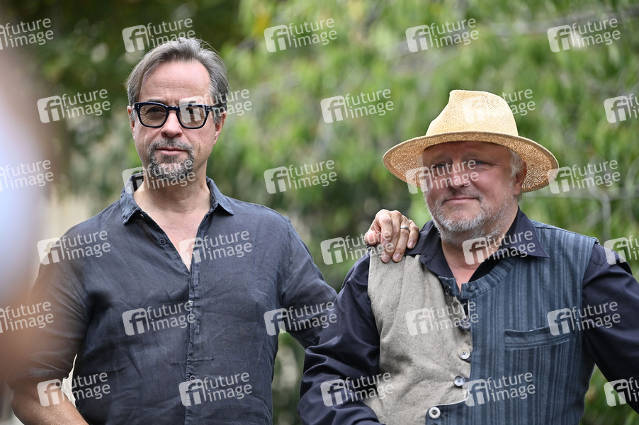 Jan Josef Liefers und Axel Prahl beim Presserundgang 'Spurensuche Tatort Münster' an original Drehorten mit dem Tatort-Cast zum 20 jährigen Jubiläum des Münsteraner Tatorts. Münster, 30.08.2022