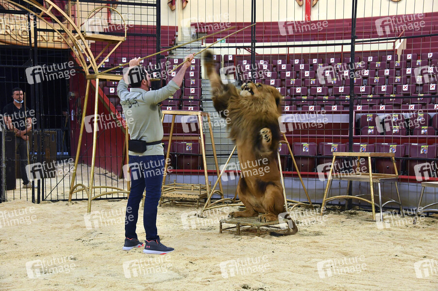 Martin Lacey jr. mit einem Löwen beim Pre-Presse-Empfang mit kommentierten Raubtiertraining im Circus Krone Bau. München, 26.06.2020