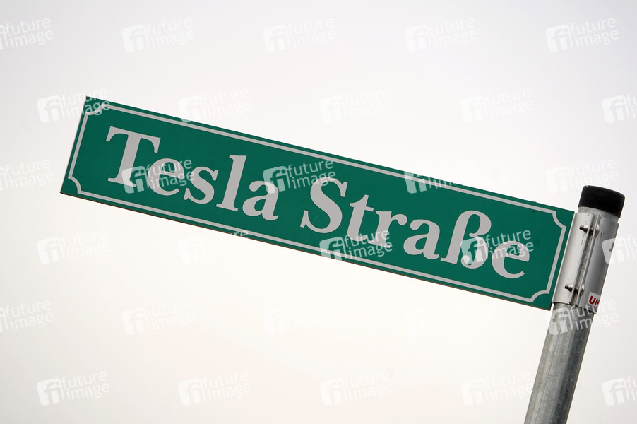 Tesla, Elektroauto, Elektrofahrzeuge, PKW, Auto, Model Y, Model 3, Großfabrik, Automobilhersteller, Autobauer, Elektromobilität, umweltfreundlich, Baustelle, Bauen, Baubranche, Bau-Branche, Bauarbeiten, Großbaustelle, Kran, Kräne, Baustelle, Straßenschild