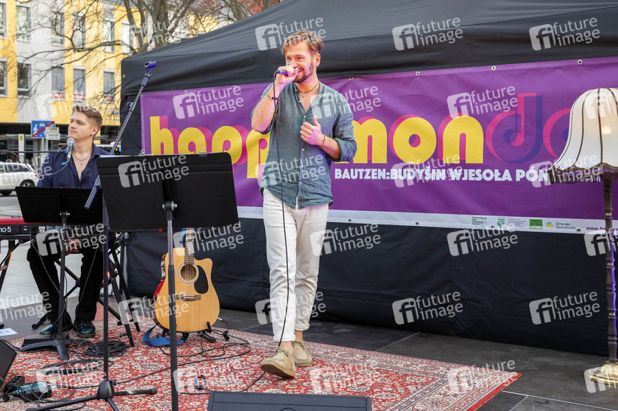 Justin Lehmann-Friese und Felix Räuber live beim ersten 'Happy Monday - Wjesola póndzela' auf dem Kornmarkt. Bautzen, 08.04.2024