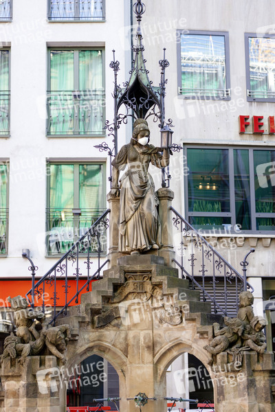 Die Schneidersfrau auf dem Heinzelmännchenbrunnen in der Kölner Altstadt hat eine Atemschutzmaske um. Köln, 18.03.2020