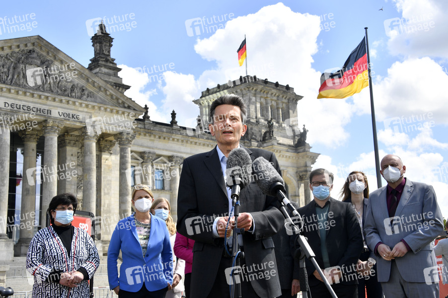 Rolf Mützenich und Fraktionsmitglieder bei einer Aktion über die Bilanz der Arbeit der SPD-Bundestagsfraktion vor dem Reichstagsgebäude. Berlin, 20.05.2021