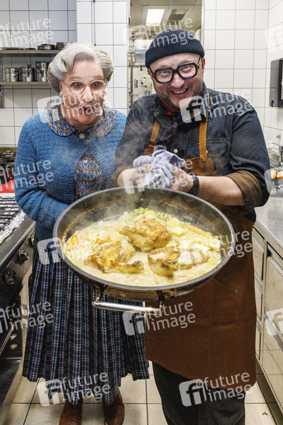 Mrs. Doubtfire / Dustin Smailes und Sebastian Lege beim Zubereiten eines cremigen One-Pan-Chicken im Paris Club Restaurant im 25hours Hotel Das Tour. Düsseldorf, 15.01.2026