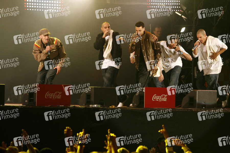 Culcha Candela live beim Coca Cola 'Soundwave 2007' vor dem Brandenburger Tor in Berlin. Die Sänger Jonny Strange (Uganda), Larsito (Kolumbien), Itchyban (Polen), Lafrotino (Kolumbien), Mr. Reedoo (Deutschland), Don Cali (Kolumbien) und DJ Chino con Estilo (Republik Korea)