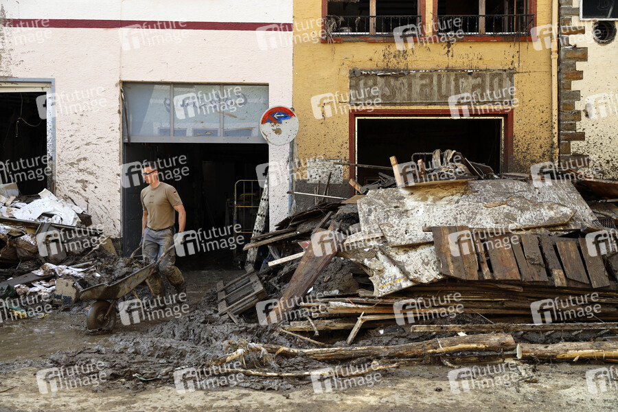 Nach dem Jahrhunderthochwasser in der Eifel durch heftige Regenfälle und Dauerregen mit Überschwemmungen und Überflutungen haben die Aufräumarbeiten im Ahrtal begonnen. Einheiten von Polizei, THW, Bundeswehr und Feuerwehr mitsamt vielen freiwilligen Helfern räumen Straßen, entfernen Schutt und Schlamm und versorgen die Menschen. Im Bild zerstörte Häuser in der Ortschaft Altenahr, in der die Flut viele Häuser zerstörte, 22.07.2021